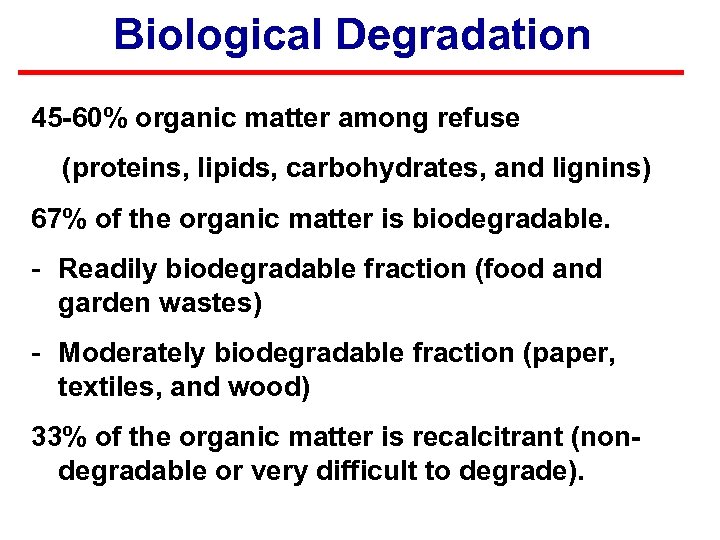 Biological Degradation 45 -60% organic matter among refuse (proteins, lipids, carbohydrates, and lignins) 67% of the organic matter is biodegradable. - Readily biodegradable fraction (food and garden wastes) - Moderately biodegradable fraction (paper, textiles, and wood) 33% of the organic matter is recalcitrant (nondegradable or very difficult to degrade).