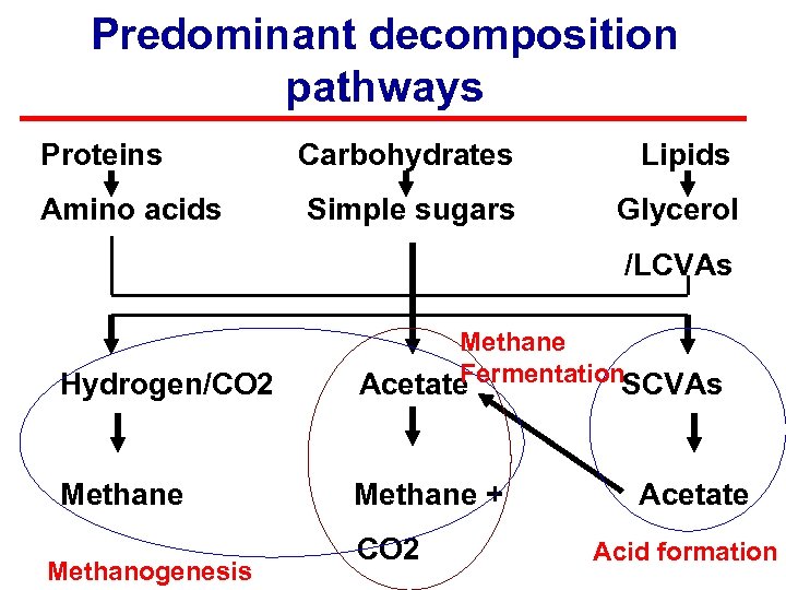 Predominant decomposition pathways Proteins Carbohydrates Lipids Amino acids Simple sugars Glycerol /LCVAs Hydrogen/CO 2 Methane Fermentation. SCVAs Acetate Methane + Methanogenesis CO 2 Acetate Acid formation