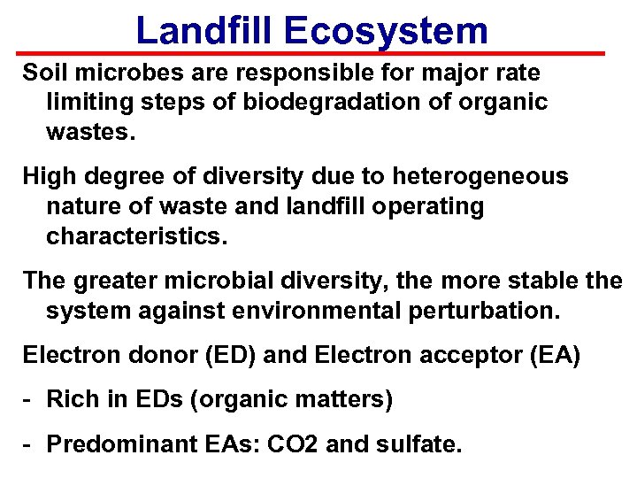 Landfill Ecosystem Soil microbes are responsible for major rate limiting steps of biodegradation of organic wastes. High degree of diversity due to heterogeneous nature of waste and landfill operating characteristics. The greater microbial diversity, the more stable the system against environmental perturbation. Electron donor (ED) and Electron acceptor (EA) - Rich in EDs (organic matters) - Predominant EAs: CO 2 and sulfate.