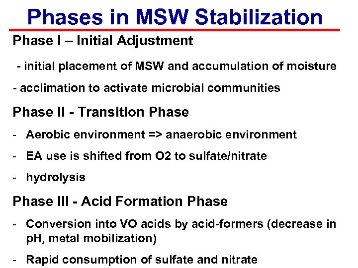 Phases in MSW Stabilization Phase I – Initial Adjustment - initial placement of MSW and accumulation of moisture - acclimation to activate microbial communities Phase II - Transition Phase - Aerobic environment => anaerobic environment - EA use is shifted from O 2 to sulfate/nitrate - hydrolysis Phase III - Acid Formation Phase - Conversion into VO acids by acid-formers (decrease in p. H, metal mobilization) - Rapid consumption of sulfate and nitrate