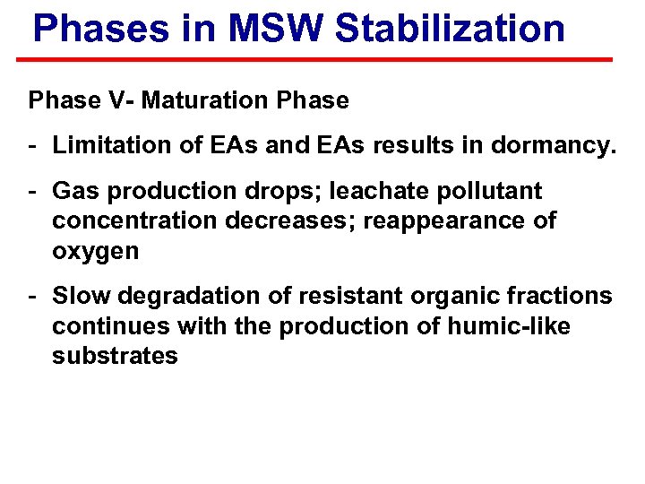 Phases in MSW Stabilization Phase V- Maturation Phase - Limitation of EAs and EAs results in dormancy. - Gas production drops; leachate pollutant concentration decreases; reappearance of oxygen - Slow degradation of resistant organic fractions continues with the production of humic-like substrates