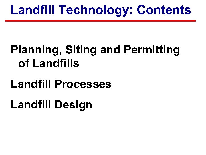 Landfill Technology: Contents Planning, Siting and Permitting of Landfills Landfill Processes Landfill Design