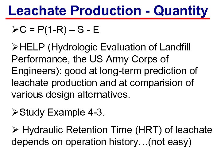 Leachate Production - Quantity ØC = P(1 -R) – S - E ØHELP (Hydrologic Evaluation of Landfill Performance, the US Army Corps of Engineers): good at long-term prediction of leachate production and at comparision of various design alternatives. ØStudy Example 4 -3. Ø Hydraulic Retention Time (HRT) of leachate depends on operation history…(not easy)