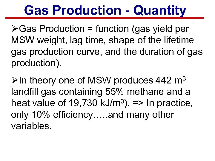 Gas Production - Quantity ØGas Production = function (gas yield per MSW weight, lag time, shape of the lifetime gas production curve, and the duration of gas production). ØIn theory one of MSW produces 442 m 3 landfill gas containing 55% methane and a heat value of 19, 730 k. J/m 3). => In practice, only 10% efficiency…. . and many other variables.