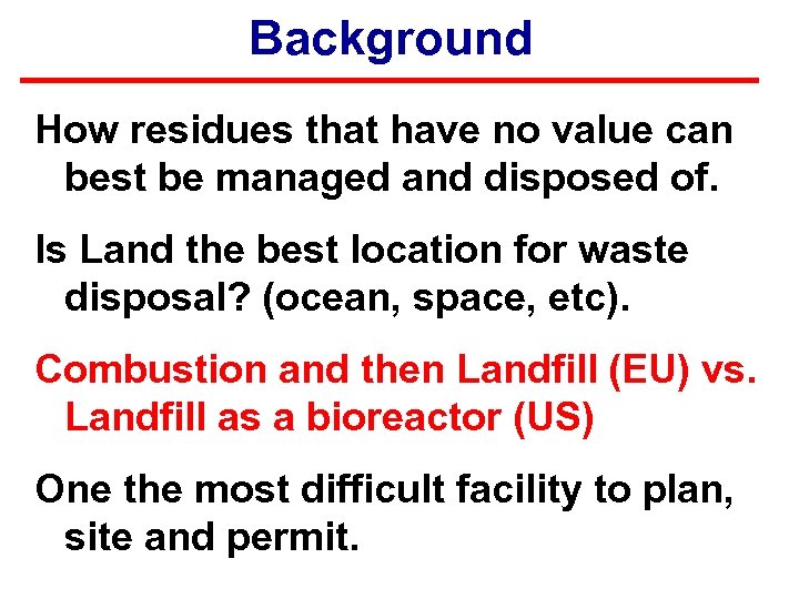 Background How residues that have no value can best be managed and disposed of. Is Land the best location for waste disposal? (ocean, space, etc). Combustion and then Landfill (EU) vs. Landfill as a bioreactor (US) One the most difficult facility to plan, site and permit.