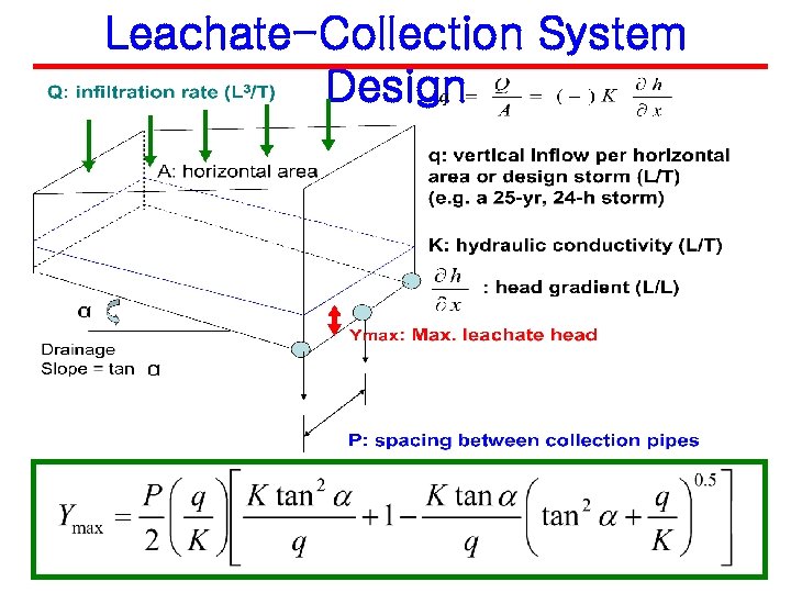 Leachate-Collection System Design Guideline Parameter Range Leachate loading rate (gpd/ac) 600 -1000 Max. leachate head (in) 9 -12 (30 cm) Pipe spacing, P (ft) 60 -400 Collection pipe dia. (in) 6 -8 Collection pipe material PVC or HDPE Pipe slope (%) 0. 5 -2 Drainage slope (%) = tan α 0. 2 -2 PLEASE STUDY EXAMPLE 4 -5. Median 750 11 180 8 HDPE 1 1