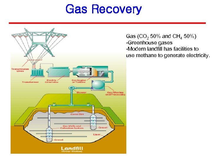 Gas Recovery Gas (CO 2 50% and CH 4 50%) -Greenhouse gases -Modern landfill has facilities to use methane to generate electricity.