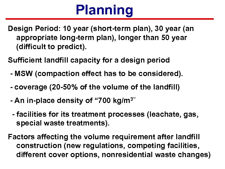 Planning Design Period: 10 year (short-term plan), 30 year (an appropriate long-term plan), longer than 50 year (difficult to predict). Sufficient landfill capacity for a design period - MSW (compaction effect has to be considered). - coverage (20 -50% of the volume of the landfill) - An in-place density of “ 700 kg/m 3” - facilities for its treatment processes (leachate, gas, special waste treatments). Factors affecting the volume requirement after landfill construction (new regulations, competing facilities, different cover options, nonresidential waste changes)