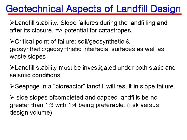 Geotechnical Aspects of Landfill Design ØLandfill stability: Slope failures during the landfilling and after its closure. => potential for catastropes. ØCritical point of failure: soil/geosynthetic & geosynthetic/geosynthetic interfacial surfaces as well as waste slopes ØLandfill stability must be investigated under both static and seismic conditions. ØSeepage in a “bioreactor” landfill will result in slope failure. Ø side slopes ofcompleted and capped landfills be no greater than 1: 3 with 1: 4 being preferable. (risk versus design volume)
