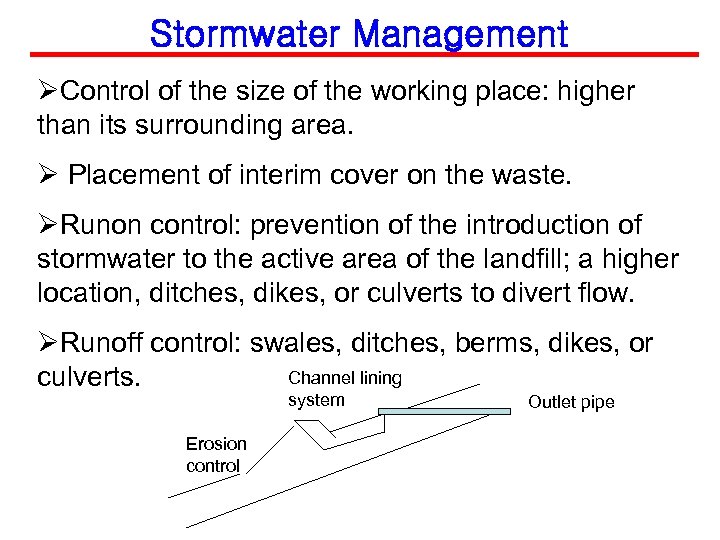 Stormwater Management ØControl of the size of the working place: higher than its surrounding area. Ø Placement of interim cover on the waste. ØRunon control: prevention of the introduction of stormwater to the active area of the landfill; a higher location, ditches, dikes, or culverts to divert flow. ØRunoff control: swales, ditches, berms, dikes, or Channel lining culverts. system Erosion control Outlet pipe