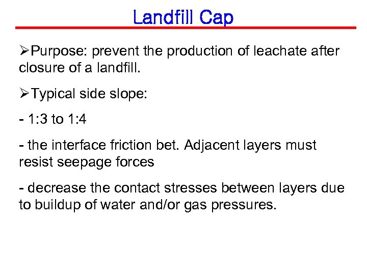 Landfill Cap ØPurpose: prevent the production of leachate after closure of a landfill. ØTypical side slope: - 1: 3 to 1: 4 - the interface friction bet. Adjacent layers must resist seepage forces - decrease the contact stresses between layers due to buildup of water and/or gas pressures.