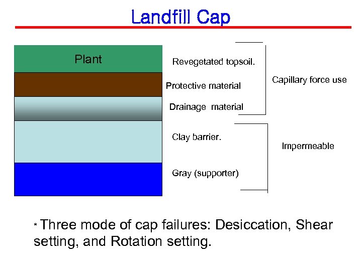 Landfill Cap Plant Revegetated topsoil. Protective material Capillary force use Drainage material Clay barrier. Impermeable Gray (supporter) * Three mode of cap failures: Desiccation, Shear setting, and Rotation setting.