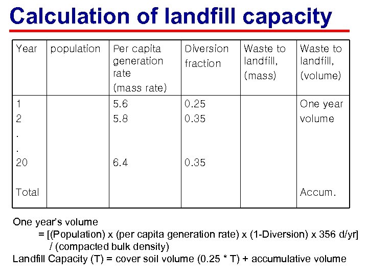 Calculation of landfill capacity Year 1 2. . 20 Total population Per capita generation rate (mass rate) Diversion fraction 5. 6 5. 8 0. 25 0. 35 6. 4 Waste to landfill, (mass) Waste to landfill, (volume) 0. 35 One year volume Accum. One year’s volume = [(Population) x (per capita generation rate) x (1 -Diversion) x 356 d/yr] / (compacted bulk density) Landfill Capacity (T) = cover soil volume (0. 25 * T) + accumulative volume
