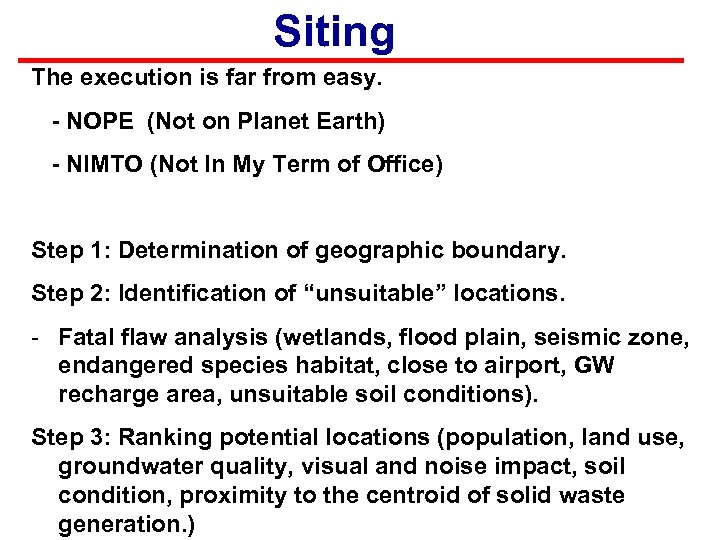 Siting The execution is far from easy. - NOPE (Not on Planet Earth) - NIMTO (Not In My Term of Office) Step 1: Determination of geographic boundary. Step 2: Identification of “unsuitable” locations. - Fatal flaw analysis (wetlands, flood plain, seismic zone, endangered species habitat, close to airport, GW recharge area, unsuitable soil conditions). Step 3: Ranking potential locations (population, land use, groundwater quality, visual and noise impact, soil condition, proximity to the centroid of solid waste generation. )