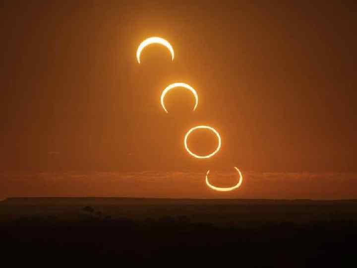 • Когда он чуть больше солнечного, полное затмение может длится до 7, 5 мин, когда равен, то одно мгновение, если же он меньше, то Луна вообще не закрывает Солнца полностью. В последнем случае происходит кольцеобразное затмение: вокруг темного лунного диска видно узкое яркое солнечное кольцо.