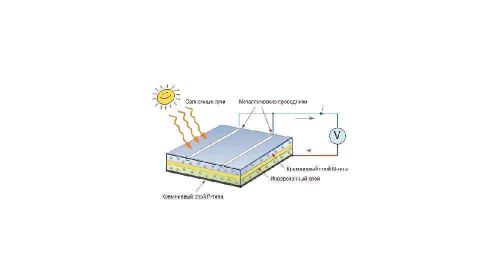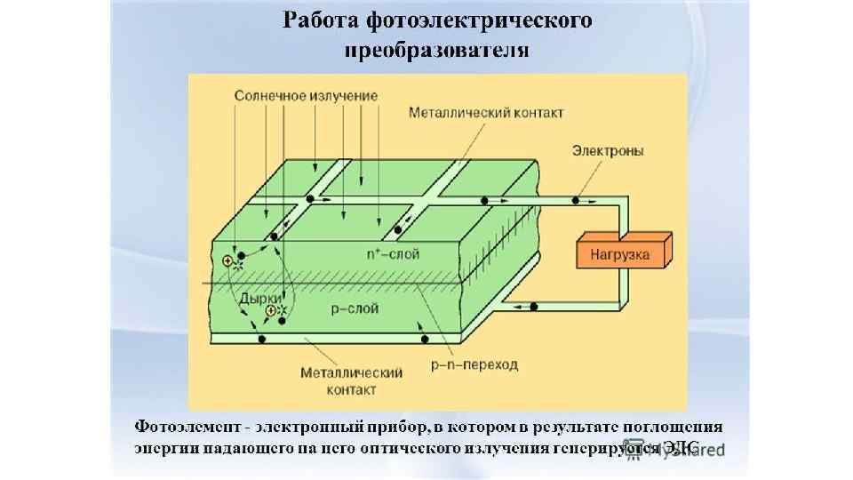 Физический принцип работы солнечных батарей • Преобразование энергии в ФЭП основано на фотовольтаическом эффекте, который возникает в неоднородных полупроводниковых структурах при воздействии на них солнечного излучения. • Неоднородность структуры ФЭП может быть получена легированием одного и того же полупроводника различными примесями (создание p- n переходов) или путём соединения различных полупроводников с неодинаковой шириной запрещённой зоны - энергии отрыва электрона из атома (создание гетеропереходов), или же за счёт изменения химического состава полупроводника, приводящего к появлению градиента ширины запрещённой зоны (создание варизонных структур). Возможны также различные комбинации перечисленных способов. • Эффективность преобразования зависит от электрофизических характеристик неоднородной полупроводниковой структуры, а также оптических свойств ФЭП, среди которых наиболее важную роль играет фотопроводимость. Она обусловлена явлениями внутреннего фотоэффекта в полупроводниках при облучении их солнечным светом.