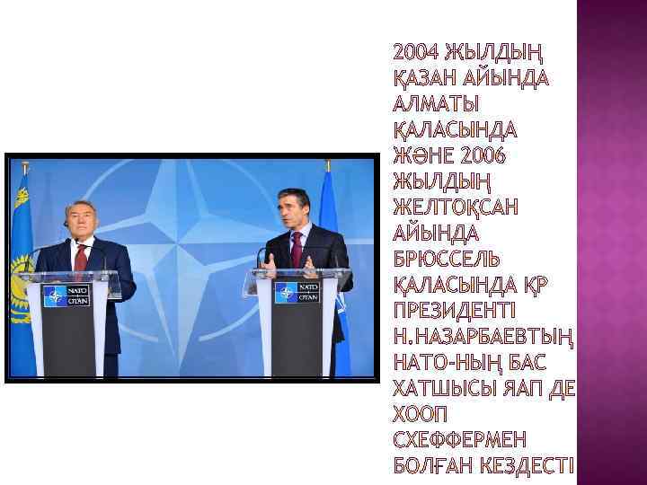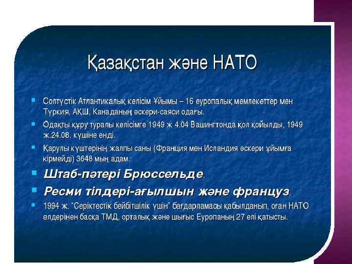 Жоспар: Кіріспе: - Солтүстік Атлантикалық Келісім Ұйымы Негізгі бөлім: -Мүше мемлекеттер -Құрылу себептері -Солтүстік Атлантикалық Келісім Ұйымы - Қазақстан Қорытынды