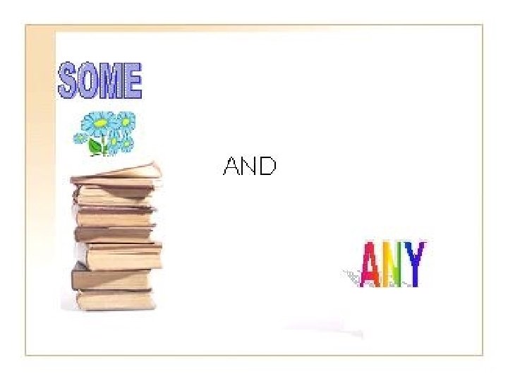 Utilizamos el indefinido “SOME””: . para referirnos a una cantidad de algo o a un número de personas o cosas que no precisamos con absoluta claridad y esto lo podemos hacer: ? refiriéndonos a una cantidad o un número sin especificar si es mucho, poco, grande o pequeño porque, realmente, no importa. There are some boys and girls in the park Hay algunos chicos y chicas en el parque ? cuando queremos hacer ver que esta cantidad o número es bastante grande. His house is some kilometres away from his office Su casa está a algunos(bastantes) kilómetros de la oficina ? o cuando queremos expresar justo lo contrario, que la cantidad o el número es pequeño, aunque lo realmente importante es que hay. There is some milk in the fridge Hay (un poco) algo de leche en la nevera