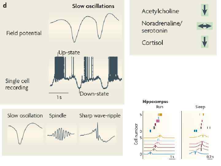 Функции сна Восстановление мозга : Изменяется экспрессия многих генов по разному ~ от региона мозга -Белки, задействованные в глутаматэргической передачи и синаптической пластичности, -Ферменты, участвующие в синтезе холестерина, белков, -Белки везикулярного транспорта, -Протеины экзо- и эндоцитоза, -шапероны Активации Глии Медленный сон – гомеостаз коры Быстрый сон – гомеостаз в подкорковых структурах Восстановление локомоторных, сенсорных, терморегуляторных центров, автономной нервной системы Организм строится во время сна + восстанавливаются системы, задействованные днем Пролактин, ФСГ, СТГ ТТГ, АКТГ, КА
