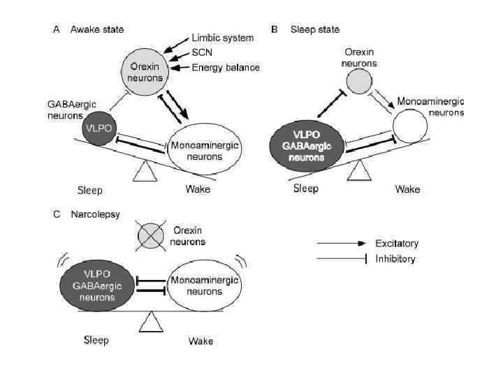 Бодрствование: Подкорковые активирующие структуры: -Задний гипоталамус (гипокретин/орексин) -Ретикулярная формация (ацетилхолин, глутамат) -Голубое пятно (Норадреналин) бугорково-маммилярные ядра (гистамин) -Базальная область переднего мозга (ацетилхолин) -Ядра Шва (серотонин) -Вентральное покрышечное пространство (дофамин) супрахиазматические ядра (биологические часы)
