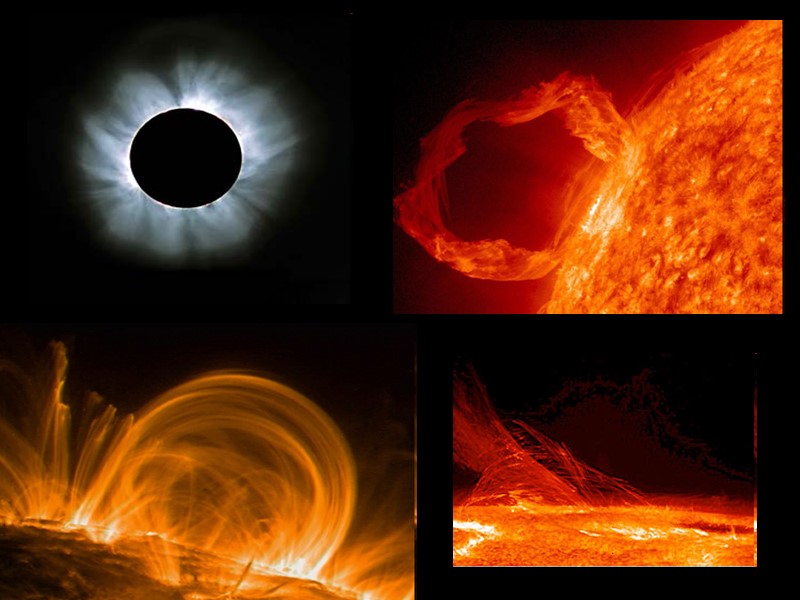 Коли волокна виходять на видимий край (лімб) Сонця, можна бачити найбільш грандіозні по масштабах активні і спокійні утворення - протуберанці, що відрізняються багатою розмаїтістю форм і СКП-адною структурою. Потрібно ще відзначити корональні діри - області в атмосфері Сонця з відкритим у міжпланетний простір магнітним полем. Це своєрідні вікна, з яких викидається високошвидкісний потік сонячних заряджених часток. Коли волокна виходять на видимий край (лімб) Сонця, можна бачити найбільш грандіозні по масштабах активні і спокійні утворення - протуберанці, що відрізняються багатою розмаїтістю форм і СКП-адною структурою. Потрібно ще відзначити корональні діри - області в атмосфері Сонця з відкритим у міжпланетний простір магнітним полем. Це своєрідні вікна, з яких викидається високошвидкісний потік сонячних заряджених часток.