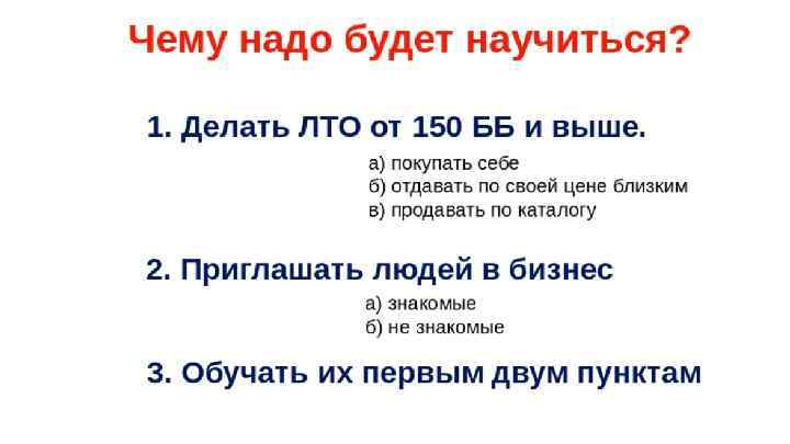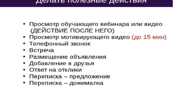 Система действий -2 дня 1. Обязательно посмотреть видео « Суть бизнеса в проекте Прорыв» 2. Проговорить все акции и тонкости первого заказа 3. Изучить Маркетинг- план, поставить цель на год и 6 месяцев , проговорить ее 4. Дать расписание на вебинары- скидывать в личку, предупреждать о вебинарах 5. Добавить в чат “первые 21 день”