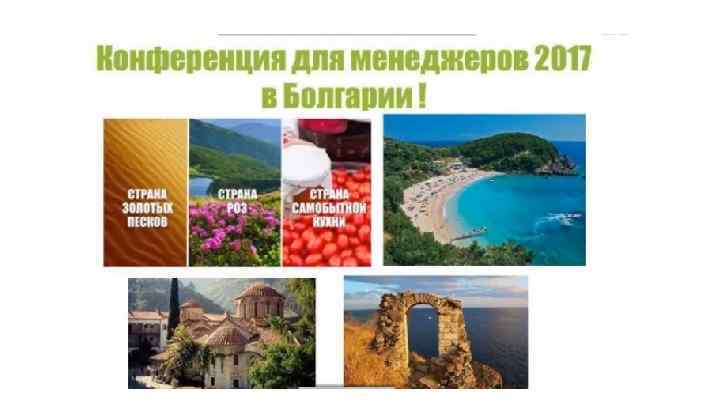 Дополнительная возможность в квалификации на Конференцию Менеджеров Квалификационный период на Менеджерскую Конференцию 2017 года с К 12 -2016 по К 08 -2017 АЛЬТЕРНАТИВНЫЕ УСЛОВИЯ ДЛЯ МЕНЕДЖЕРОВ: Стань Старшим Менеджером в течение основного периода квалификации с каталога № 12 2016 по каталог № 1 2017 и подтверди это звание в каталоге № 1 2017 Повторяй это достижение 1 -5 периодов каталогов (c каталогом № 1 2017 включительно). Стань Директором до каталога № 8 2017 Размещай личные заказы на 150 ББ в каждом каталоге квалификации. Получи путевку в Болгарию независимо от количества квалифицированных рекрутов в твоей Персональной Группе!