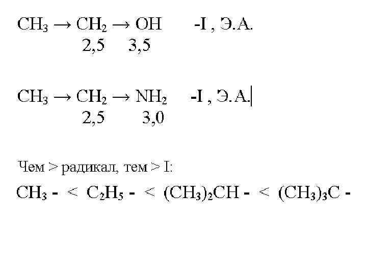 Заместители, по сравнению с атомом Н, смещающие сильнее электронную плотность σ-связи в сторону цепи (от себя), увеличивают электронную плотность в цепи, проявляют +I, электронодонорные свойства (Э. Д. ): радикалы, анионы, металлы.
