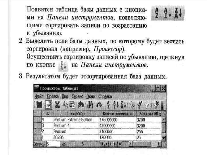 Сортировка записей производится по какому-либо полю. Значения, содержащиеся в этом поле, располагаются в определенном порядке, который определяется типом поля: • по алфавиту, если поле текстовое; • по величине числа, если поле числовое; • по дате, если тип поля - Дата/Время и так далее. Сортировка записей может производиться либо по возрастанию, либо по убыванию значений поля. В процессе сортировки целостность записей сохраняется, то есть они переносятся из одного места таблицы в другое целиком.