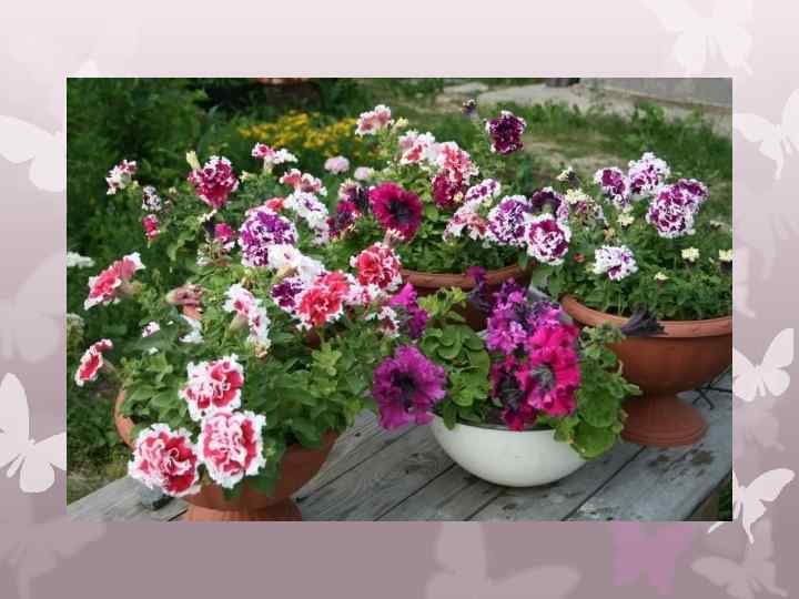 Выводы 1. Все изучаемые серии петунии садовой можно успешно выращивать в наших условиях и использовать для городского озеленения. 2. Длительность периода цветения зависит от серий: -крупноцветковые петунии- 78 дней; -мелкоцветковые- 72 дня; -многоцветковые- 75 дней; -махровые- 58 дней; -гибридные- 68 дней. 3. Наибольшая декоративность отмечается у серии Dable Cascad F 1, Sonata F 1 и составляет 95, 2 баллов. 4. Наиболее устойчива к неблагоприятным погодным условиям серия Explorer F 1, Easy Wave F 1. 5. Уровень рентабельности составил в среднем от 23, 4% до 296, 5%.