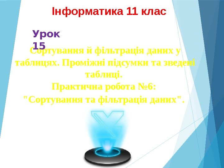 Сортування й фільтрація даних у таблицях. Проміжні підсумки та зведені таблиці. Практична робота № 6: «Сортування та фільтрація даних». Інформатика 11 клас Урок
