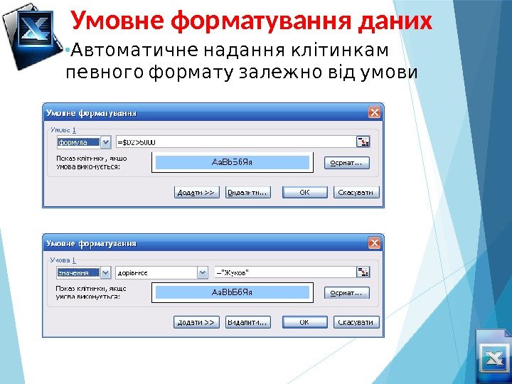 Умовне форматування даних • Автоматичне надання клітинкам певного формату залежно від умови