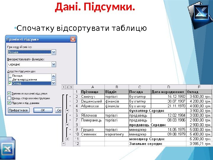 Дані. Підсумки. • Спочатку відсортувати таблицю