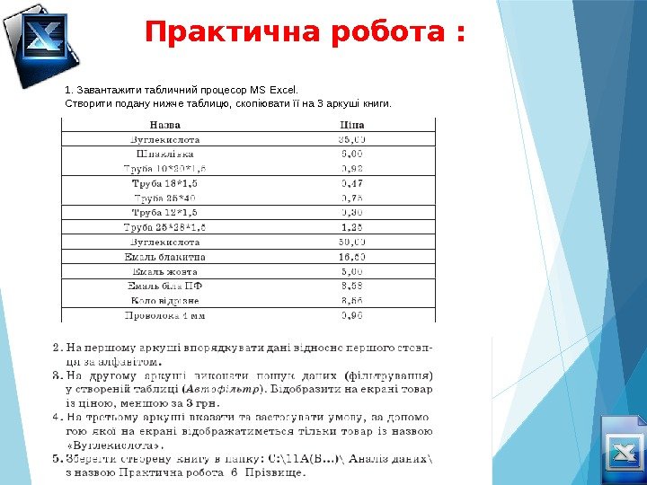 Практична робота : 1. Завантажити табличний процесор MS Excel. Створити подану нижче таблицю, скопіювати її на 3 аркуші книги.