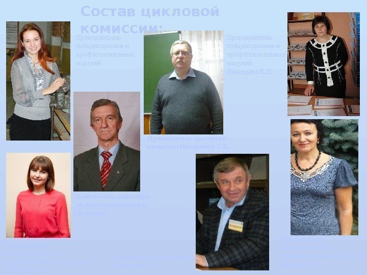 Состав цикловой комиссии: Председатель цикловой комиссии Назаренко С. Е. Преподаватель спецдисциплин и профессиональных модулей Лисицына Е. П. Преподаватель спецдисциплин и профессиональных модулей Букреева Л. П. Преподаватель спецдисциплин и профессиональных модулей Лапшина О. В. Заместитель директора по производственному обучению Заведующий отделением Касьянов С. В.