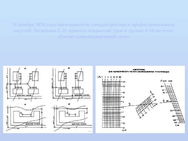18 ноября 2016 года преподаватель спецдисциплин и профессиональных модулей Лисицына Е. П. провела открытый урок в группе 4 -10 на тему: «Расчет канализационной сети»