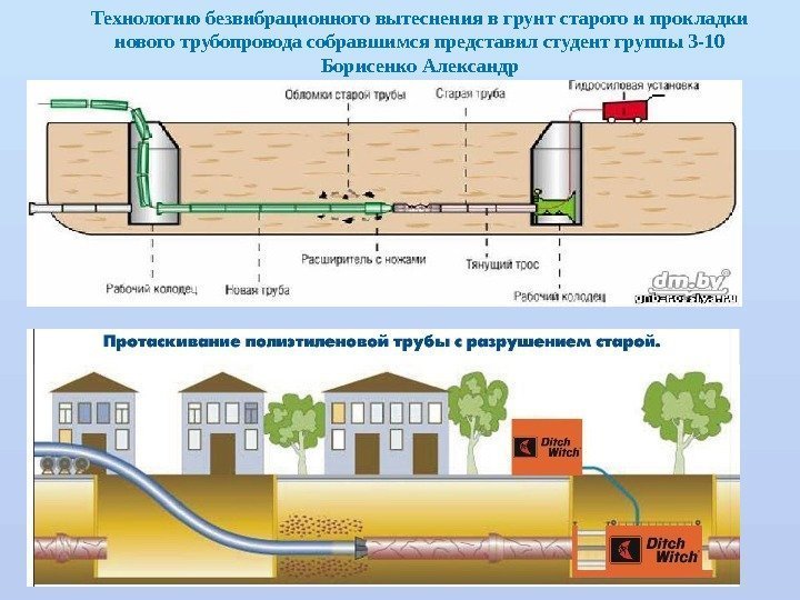 Технологию безвибрационного вытеснения в грунт старого и прокладки нового трубопровода собравшимся представил студент группы 3 -10 Борисенко Александр