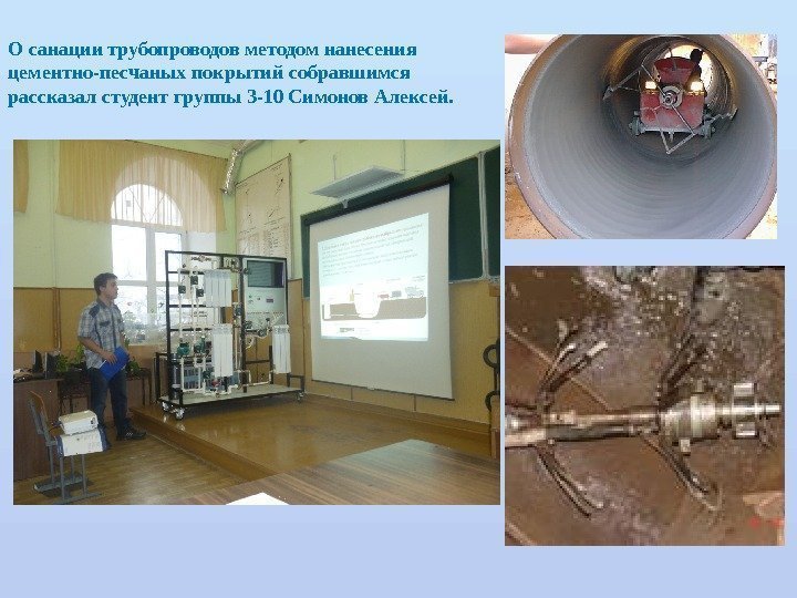 О санации трубопроводов методом нанесения цементно-песчаных покрытий собравшимся рассказал студент группы 3 -10 Симонов Алексей.