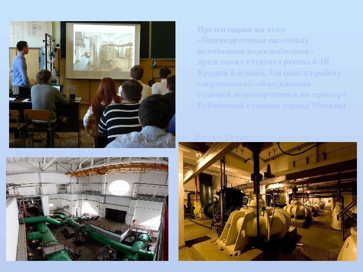 Презентацию на тему «Водоподготовка наземных источников водоснабжения» представил студент группы 4 -10 Курдин Евгений. Он описал работу современного оборудования станций водоподготовки на примере Рублевской станции города Москвы . Блок очистных сооружений Насосный зал