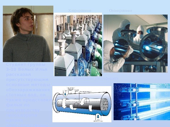 Студент группы 3 -10 Белых Илья рассказал присутствующим основные методы обеззараживания сточных вод, он также представил фильм по производству гипохлорита натрия непосредственно на водопроводной станции Хлорирование Озонирование Применение ультрафиолета