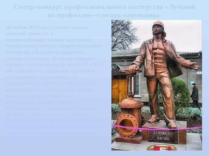Смотр-конкурс профессионального мастерства «Лучший по профессии—слесарь-сантехник» 18 ноября 2016 года в рамках декады цикловой комиссии в учебно-производственных мастерских прошел смотр-конкурс профессионального мастерства «Лучший по профессии слесарь-сантехник» . В смотре-конкурсе приняли участие студенты групп 4 -3 и 4 -10, обучающиеся по программе подготовки специалистов среднего звена по специальности «Монтаж и эксплуатация внутренних сантехнических устройств, кондиционирования воздуха и вентиляции» , «Водоснабжение и водоотведение» в количестве 20 человек. Во время проведения смотра-конкурса студенты показали хорошие теоретические знания и практические навыки. Победители смотра-конкурса награждены дипломами 1 -й, 2 -й и 3 -й степени.