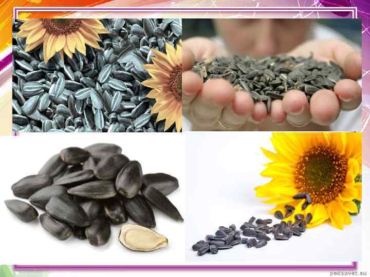 Состав и полезные свойства семечек подсолнечника • • • содержат белки, жиры, аминокислоты, витамины Е, С, каротин и витамины группы В. Белок их сбалансирован не намного хуже мясного. источник витамина D. В 100 граммах семечек содержится магния – в 6 раз больше, чем в ржаном хлебе. Сырые семена помогают ускорить заживление травм мягких тканей, восстановление поврежденных костей и сил после перенесенных инфекционных заболеваний. Семечки улучшают аппетит. Семечка является средством профилактики атеросклероза, инфаркта миокарда и других заболеваний сердечно-сосудистой системы, а также помогают при заболевании печени и желчевыводящих путей.