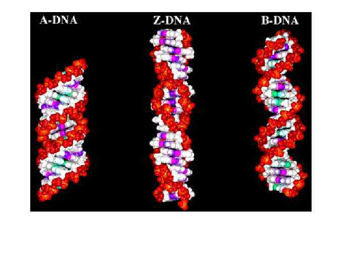 Формы ДНК А-форма (конц. р-ры с высокой I) Z-форма (CGCGCG) (гидрофобные условия, высокая I) Параметры B-форма спираль правозакручена левозакручена ед. повтора 1 пн 1 пн 2 пн пн в обороте 10, 4 10, 7 12 диаметр 23, 7 А 25, 5 А 18, 4 А вращение/пн 35, 9 33, 6 60/2 наклон пн к оси -1, 2 +19 -9 раст. м-у пн вдоль оси 0. 332 nm 0. 23 nm 0. 38 nm длина оборота 34 А 28 А 34, 4 А