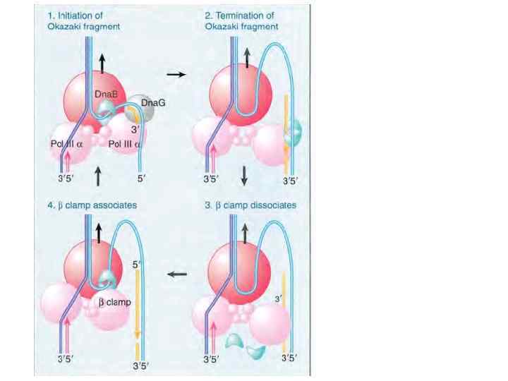 Инициация Dna. B хеликаза, расплетает Dna. G праймаза, синтезирует затравки Гираза устраняет суперспирализацию SSB стабилизирует 1 цепочечную ДНК Для начала репликации необходимо, чтобы было расплетено 60 пн