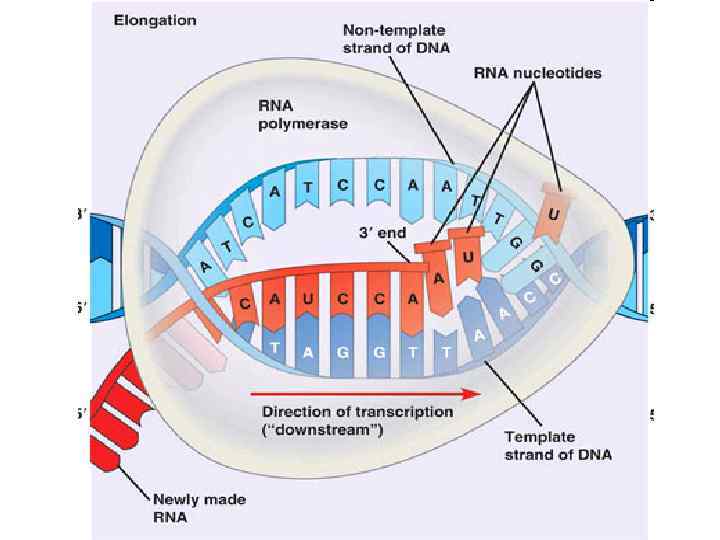 Этапы транскрипции • 1. Инициация. Происходит в области, называемой промотором. Содержит последовательность ДНК, на которой может собраться комплекс, необходимый для транскрипции. Чаще всего он содержит много пар А-Т, т. к. их проще расплавить, чем пары С-G. • 2. Элонгация. РНК-полимераза движется по двойной спирали ДНК. Спираль расплетается, по принципу комплементарности копируется только 1 цепь ДНК. • 3. Терминация. Происходит в специальной области, называемой терминатором транскрипции. Требует специальных белков.