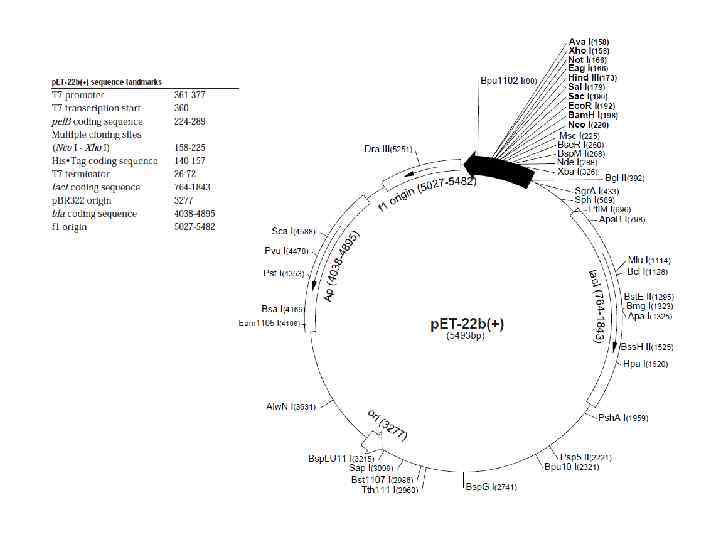 Что содержит плазмида? 1. точку начала репликации 2. маркерный ген (ген устойчивости в ампициллину) 3. промотор для инициации транскрипции 4. терминатор транскрипции 5. multiple cloning site – участок, который содержит последовательности, по которым происходит специфичное разрезание ДНК – для того, чтобы в плазмиду можно было вставить интересующий ген 6. некие «навески» на ген белка, которые затем помогают при его очистке