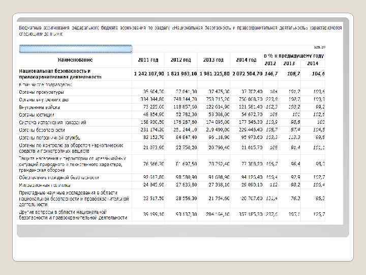 Состав и структура расходов на национальную безопасность Раздел 0300 «Национальная безопасность и o o o o правоохранительная деятельность» 0301 «Органы прокуратуры» 0302 «Органы внутренних дел» 0303 «Внутренние войска» 0304 «Органы юстиции» 0305 «Система исполнения наказаний» 0306 «Органы безопасности» 0307 «Органы пограничной службы» 0308 «Органы по контролю за оборотом наркотических средств и психотропных веществ» 0309 «Предупреждение и ликвидация последствий чрезвычайных ситуаций и стихийных бедствий, гражданская оборона» 0310 «Обеспечение противопожарной безопасности» 0311 «Миграционная политика» 0312 «Прикладные научные исследования в области национальной безопасности и правоохранительной деятельности» 0313 «Другие вопросы в области национальной безопасности и правоохранительной деятельности»