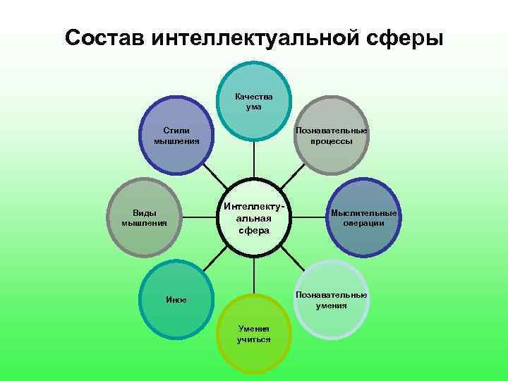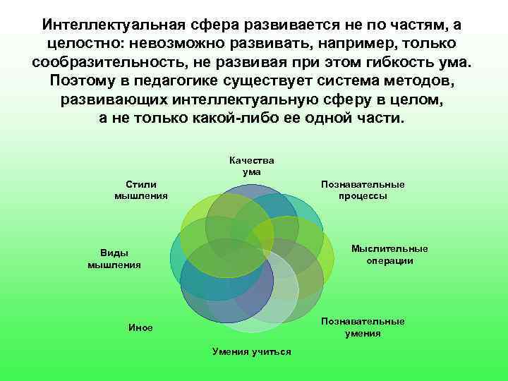 Интеллектуальная сфера развивается не по частям, а целостно: невозможно развивать, например, только сообразительность, не развивая при этом гибкость ума. Поэтому в педагогике существует система методов, развивающих интеллектуальную сферу в целом, а не только какой-либо ее одной части. Качества ума Стили Познавательные мышления процессы Виды Мыслительные мышления операции Познавательные Иное умения Умения учиться