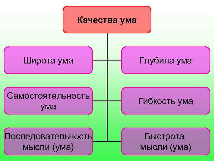 Качества ума Широта ума Глубина ума Самостоятельность Гибкость ума Последовательность Быстрота мысли (ума)