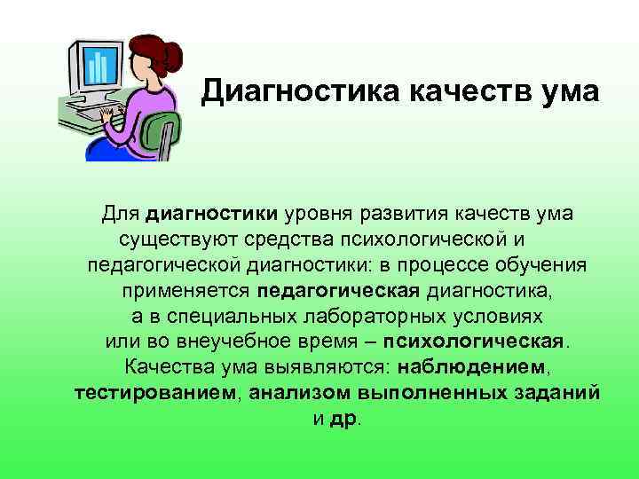 Диагностика качеств ума Для диагностики уровня развития качеств ума существуют средства психологической и педагогической диагностики: в процессе обучения применяется педагогическая диагностика, а в специальных лабораторных условиях или во внеучебное время – психологическая. Качества ума выявляются: наблюдением, тестированием, анализом выполненных заданий и др.